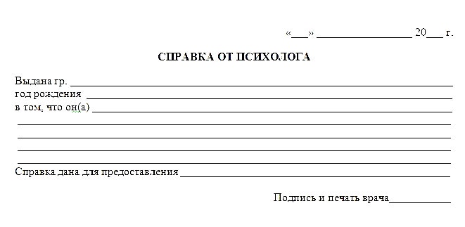 Справка от психолога подтверждает психо-эмоциональное состояние обладателя. В ней может быть отражена информация о бывших или имеющихся на данный момент проблемах. Также справка может подтверждать отсутствие каких-либо патологий. Именно поэтому справка от психолога может быть затребована в следующих случаях: