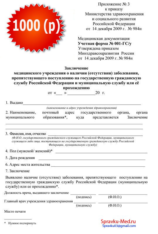 001 ГСУ для работодателя требуется в качестве подтверждения того, что у потенциального работника нет медицинских противопоказанийСправка на Госслужбу занимать ту или иную должность. Для самого же работника этот документ будет являться официальным доказательством, в случае получения профзаболевания. Проходя ежегодные осмотры, можно будет сделать вывод, что то или иное заболевание является приобретенным на рабочем месте. В зависимости от этого рабочий сможет рассчитывать на онлайнпенсацию вреда нанесенного его здоровью.